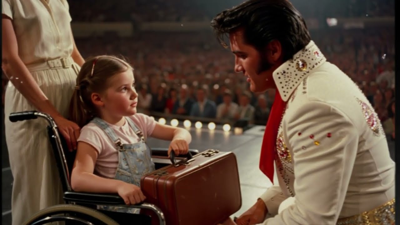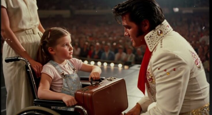 The show began as usual, but something was off. During the second verse of “Suspicious Minds,” Elvis faltered, forgetting the words for the first time in memory. The audience leaned in, sensing the change. That’s when a small figure appeared at the edge of the stage: a little girl in a battered wheelchair, clutching an old suitcase.